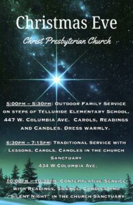 Christmas Eve Services – 5:00pm Outdoor Carols, Candlelit and Hot Cocoa on front steps of Elementary school. And 6:30pm Sanctuary service with Carols, Candlelit, and Hot Cocoa. 10:00pm a 30-minute Contemplative service with candlelight, readings and silence.
